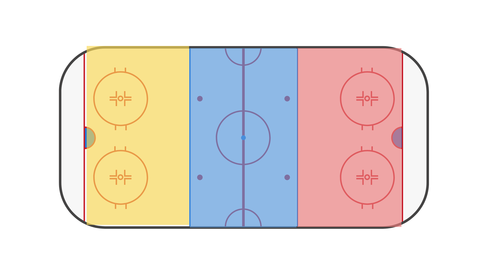 - Obranná tretina: Táto časť ľadu je blízko k vlastnej bránke tímu a je miestom, kde sa hráči sústredia na obranu a snažia sa zabrániť súperom v strelení gólu.