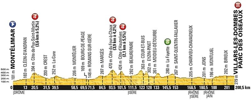 Sobotňajšia 14. etapa z Montélimaru do Villars-les-Dombes Parc des Oiseaux (208,5 km) je predposlednou v aktuálnej edícii pretekov, v ktorej cyklisti budú musieť prekonať vzdialenosť vyše 200 km. Na štarte sa predstaví 187 z pôvodného počtu 198 cyklistov, ktorí si to namieria severne údolím rieky Rhôna. Etapa má mierne zvlnený profil s troma vrchárskymi prémiami štvrtej kategórie v prvej polovici, ale takmer úplnou rovinou v druhej časti. Už na 20,5 km bude na ceste prvá "štvorka" Côte de Puy-Saint-Martin (dlĺžka 3,6 km, priemerný sklon 5.2%), na 93,5 km príde na rad Côte du Four-á-Chaux (3,9 km, 4.2%) a na 101,5 km Côte d'Hauterives (2,1 km, 5.5%).