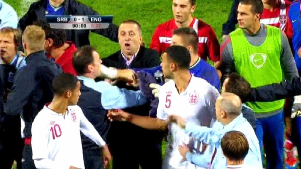 V barážovom stretnutí prehrala srbská 21-tka s Anglickom 0:1 a na európsky šampionát postúpil jej súper. Nuž a to mladíci v Kragujevaci nedokázali predýchať. Už na ihrisku sa do seba pustili hráči oboch celkov, facky lietali na všetky na strany.