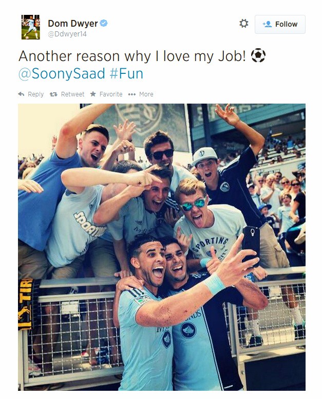 KANSAS / Selfie fotografie opantali celý svet! Dôkazom je aj futbalista Dom Dwyer zo Sporting Kansas, ktorý oslávil gól selfie fotkou.