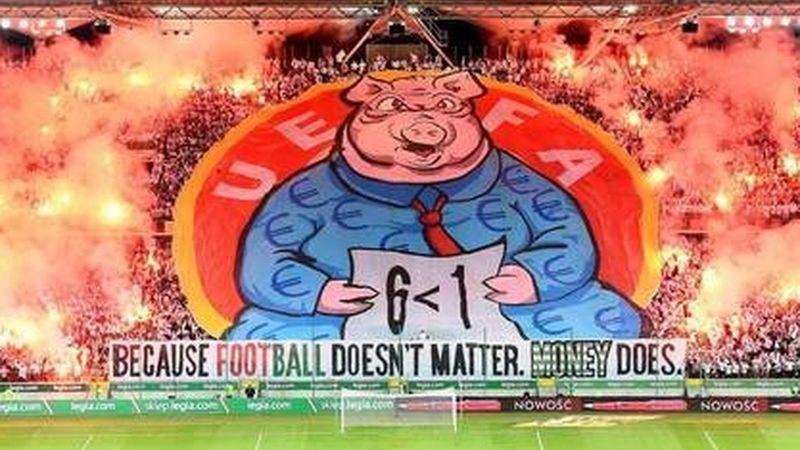 Domáci fanúšikovia si pre nenávidenú UEFA priprafili trefné choreo. Pretože o futbal nejde, ale o peniaze áno! Písalo sa na obrovskom transparente pod ešte v praäčším prasaťom v logu UEFA a oblečenom v košeli so znakmi eura a držiacom odkaz, že šesť gólov je menej ako jeden.