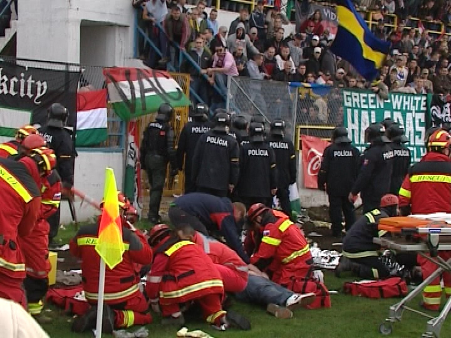 Do začiatku druhého polčasu futbalového zápasu 14. kola Corgoň ligy DAC Dunajská Streda - Slovan Bratislava previezli zo štadióna v Dunajskej Strede do miestnej nemocnice šesť osôb, prevažne s poraneniami hlavy. Jedného zo zranených, ktorý údajne spadol z tribúny, transportoval vrtuľník Leteckej záchrannej zdravotnej služby (LZZS) Air Transport Europe do Nemocnice na bratislavských Kramároch.
