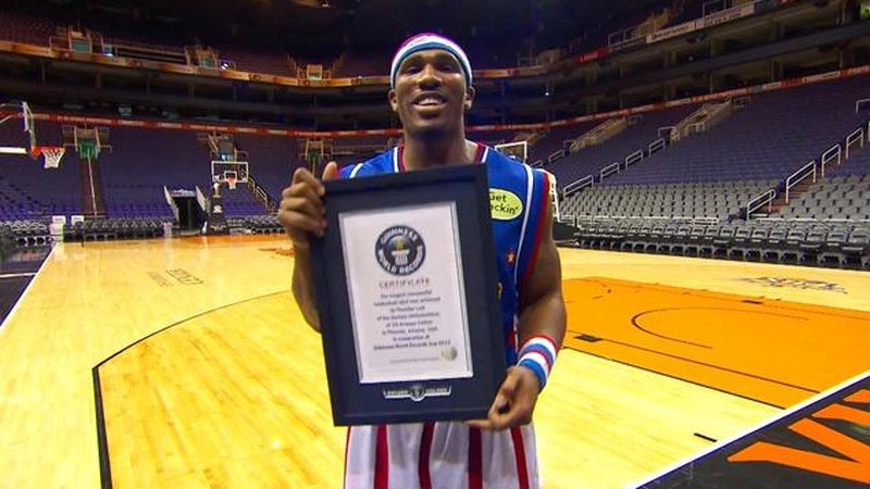 PHOENIX / Thunder Law z tímu basketbalových kúzelníkov Harlem Globetrotters stanovil nový svetový rekord vo vzdialenosti úspešnej strely stojac chrbtom ku košu.