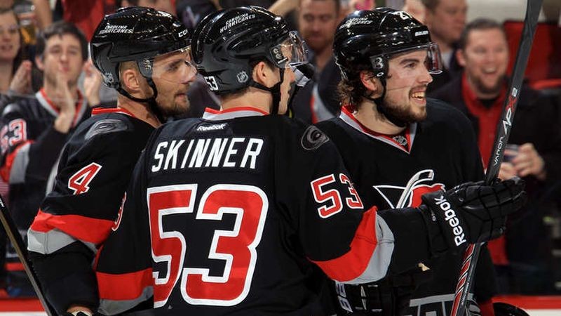 Góly: 10. Riley Nash (T. Ruutu), 11. Siomin, 19. Bellemore (Lindholm, Skinner), 25. Tlustý (E. Staal), 53. SEKERA (Skinner, J. Staal) - 16. Bjugstad (Olsen, Upshall)