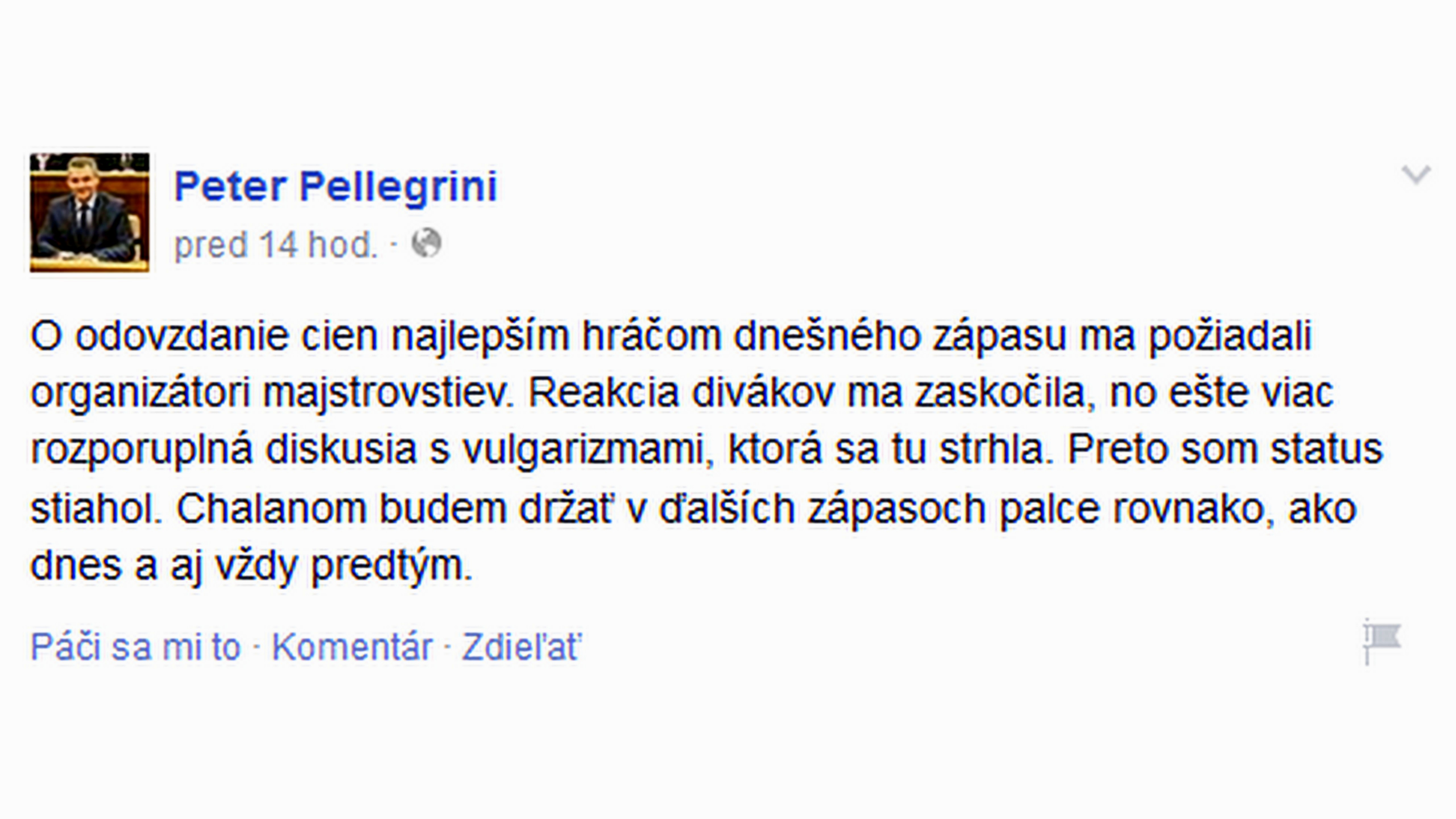 Pellegrini najskôr uverejnil na svojom facebooku selfie s hokejistami. S komentárom, že dúfa, že ide o budúcich majstrov sveta. Tú pre nespočetné množstvo vulgarizmov nakoniec stiahol.