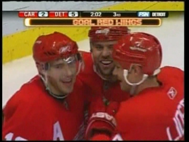 Góly: 5. Filppula (Hudler, Lidström), 27. Franzen (Cleary, Hudler), 33. Lilja (Kronwall, Hudler), 58. Daciuk, 58. Holmström (Zetterberg, Lidström) - 21. Cole (Gleason), 31. Cole (Walker, F. Kaberle). Vylúčení: 6:7 na 2 min, presilovky: 1:1, oslabenia: 0:0. Strely na bránku: 38:17. Brankári: Hašek - Ward. Diváci: 19 609