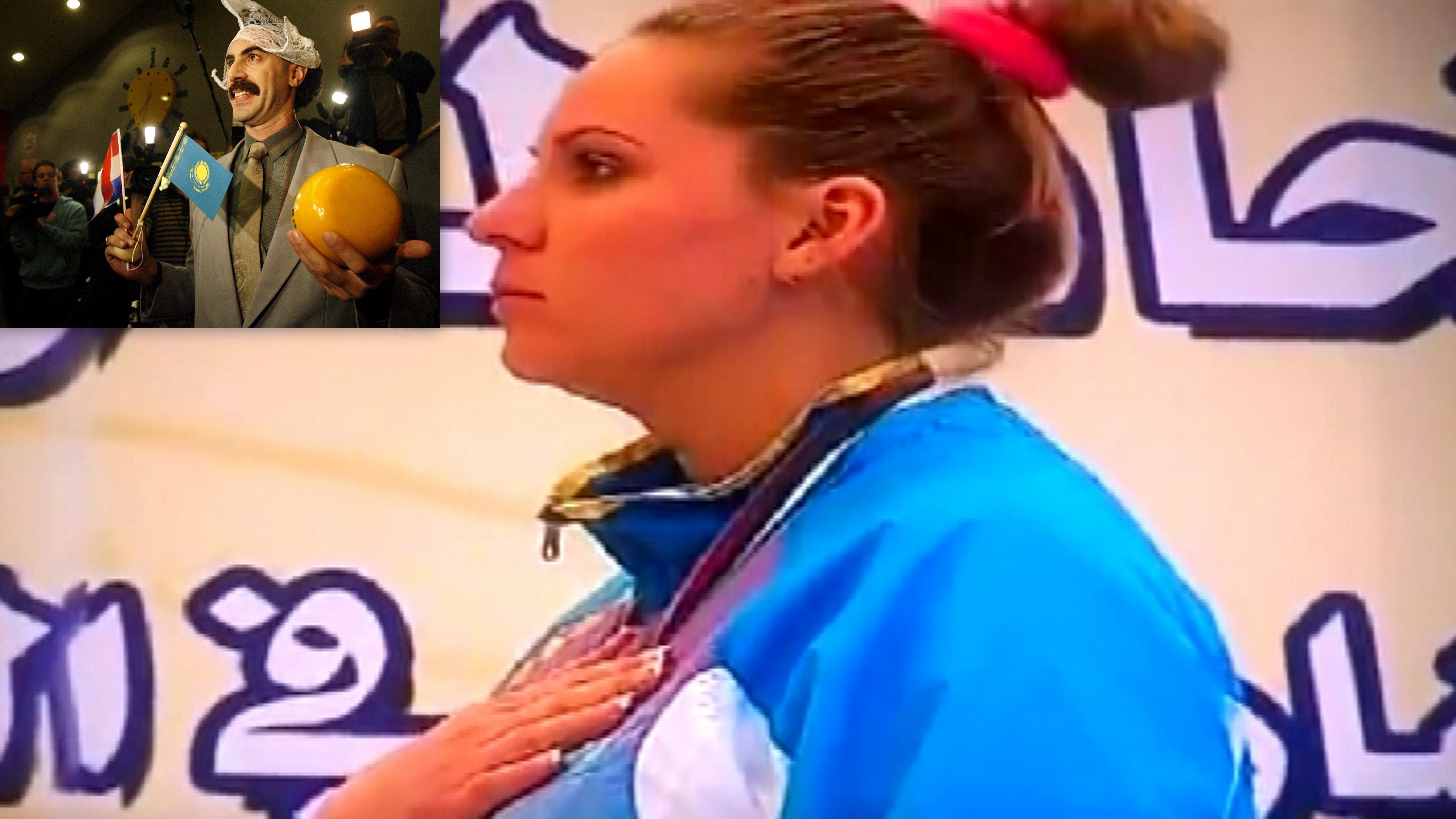 Keď vystupovala kazašská športovkyňa na najvyšší stupienok ako víťazka streleckých pretekov Grand Prix v Kuvajte, ani v najhoršom sne jej nenapadlo, čo ju čaká. Organizátori jej totiž omylom nepustili národnú hymnu Kazachstanu, ale verziu v podaní Borata z paródie "Nakúkanie do ameryckej kultúry na objednávku slavnoj kazašskoj národa".