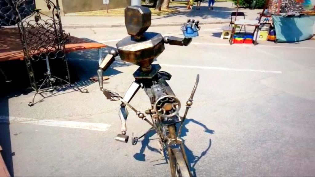 Zaujímavosťou sochárskej tvorby umeleckého kováča Eperješiho je, že svoje postavičky skladá zo starožitných častí už nepotrebných strojov. Každá socha je tak jedinečná a bez repliky. Keď sa lepšie pozriete na cyklistu, uvidíte že časti jeho bicykla tvorí historický šijací stroj a kolesá sú zo starého voza - vyorávača na zemiaky.