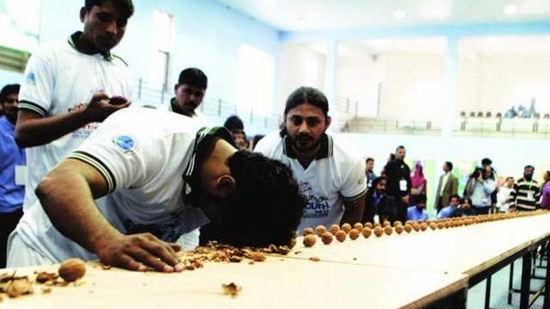 Miestny majster bojových umení Mohammad Rashid rozbil čelom až neuveriteľných 155 orechov za jednu jedinú minútu. Tým prekonal pôvodný rekord, ktorý bol zanedbateľných 44 orechov až niekoľkonásobne. Rekordné číslo i netradičná disciplína bola súčasťou Festivalu Mládeže v pakistanskej Punjabe. Nerozbolela vás pri pozeraní videa hlava?