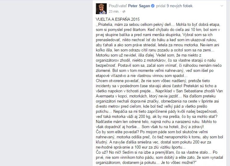 Peter Sagan mal v sobotu nešťastnú kolíziu. Zrazila ho sprievodná motorka pár kilometrov pred koncom etapy, v ktorej pomýšľal na prvenstvo. Dohru rieši na sociálnej sieti. Vedenie tímu Tinkoff - Saxo zvažuje právne kroky a stále nie je jasné, či bude Peter Sagan vo Vuelte pokračovať.