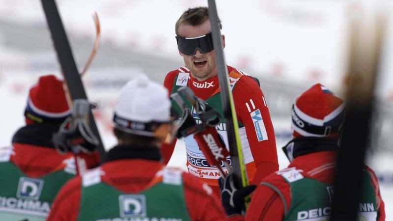 Po prvom klasickom úseku to však s predĺžením nórskej zlatej šnúry vyzeralo veľmi zle. Eldar Rönning náročný profil okruhu vo Vesci nezvládol a nielenže nezachytil nástup Nemca Jensa Filbricha, na ktorého sa dokázal zavesiť iba Kanaďan Devon Kershaw, ale odovzdával až na šiestej priečke a so stratou takmer pol minúty. Druhá klasická desiatka bola najmä v znamení Fína Samiho Jauhojärviho, ktorý eliminoval dvadsaťsekundové manko. Na čele sa vyprofilovala trojica Fínsko, Nemecko a Estónsko, ktoré v klasike profitovalo najmä z výkonu dvoch veteránov Jaaka Maeho a Andrusa Veerpala, no v skejte sa vo výsledkoch prepadlo. Nórovi Hjelmesetovi sa zo začiatku darilo približovať, no prvý korčuliarsky úsek začínal Tore Ruud Hofstad stále s výrazným deficitom. Nemec Göring sa síce najskôr definitívne zbavil Estóncov a v závere svojej časti aj Fína Kattilakoskiho. Hofstad však stiahol na poslednej odovzdávke už len na 14 sekúnd a otvoril tak perspektívnu cestu pre finišmana Pettera Northuga. Čerstvý majster sveta zo skiatlonu náskok Axela Teichmanna takmer bleskovo vymazal a až do posledného kilometra sa takticky držal v tieni nezameniteľnej postavy Nemca. V poslednej zákrute pred vjazdom na štadión Northug úchvatným spôsobom nastúpil do trháku a už po niekoľkých metroch rozhodol o svojom triumfe. Nórska bežecká výprava v Liberci získala už štvrté zlato, všetky však pochádzajú z mužskej dielne.